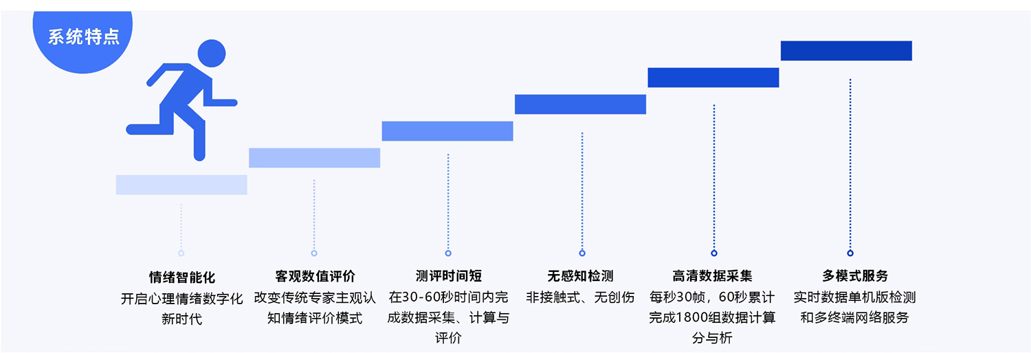 檢信ALLEMOTION多維度心理情緒測評系統開啟了心理情緒數據化新時代,為群體性人群實現高頻次的心理情緒監測提供了有效的解決方案,可以在30-60秒內完成心理情緒客觀數據的評價分析。加強高頻次的個人平時心理情緒監測,可有效掌控自身心理情緒指標的狀態,并做出相應的心理疏導與情緒放松。傳統心理量表是我們職業心理醫生輔助診斷與治療評價的工具,檢信ALLEMOTION多維度心理情緒測評系統是客觀評價個人心理情緒指數的手段,是傳統心理量表在應用上的有效補充,為我國教育、社區、部隊、企事業單位建立心理情緒健康監測及檔案管理體系提供一種有效的心理情緒檢測解決方案。